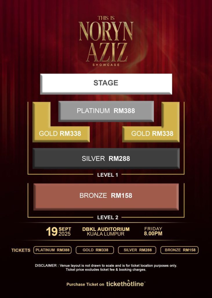 Persembahan akan berlangsung pada Jumaat, 19 September 2025, jam 8:00 malam di Auditorium DBKL, Kuala Lumpur. Tiket boleh didapati melalui Tickethotline. Tempat terhad ini bukan sekadar konsert, inilah This Is Noryn Aziz. – Tehtariktimes